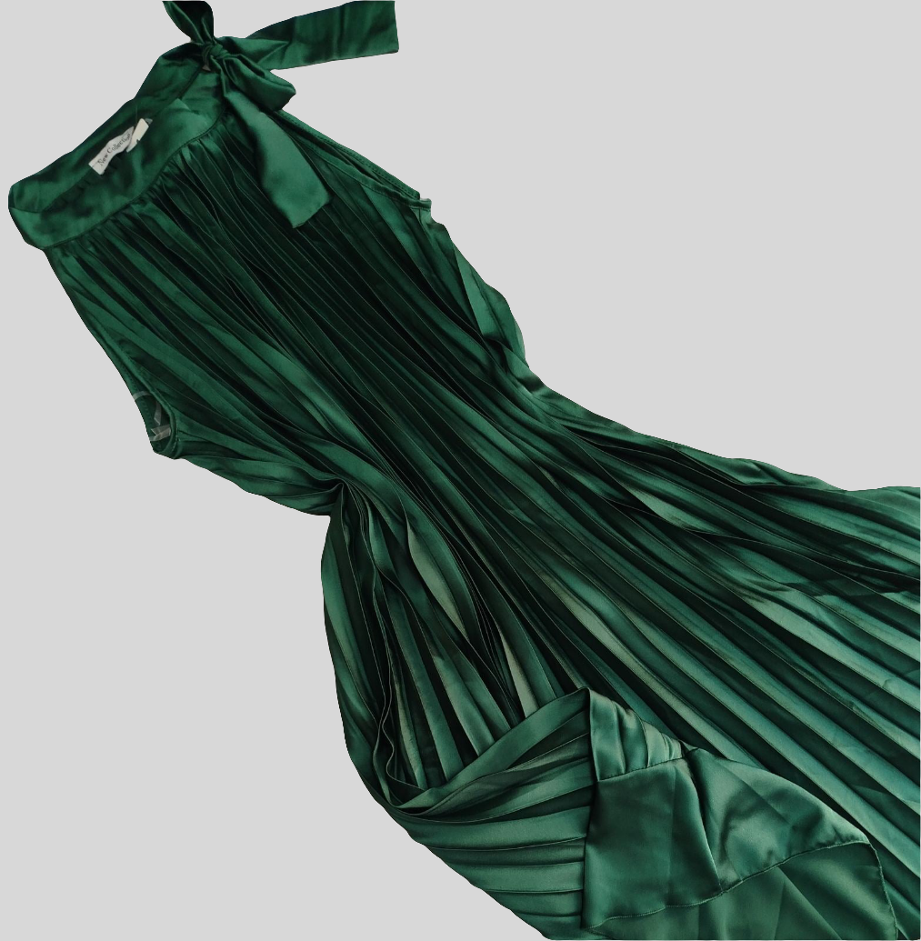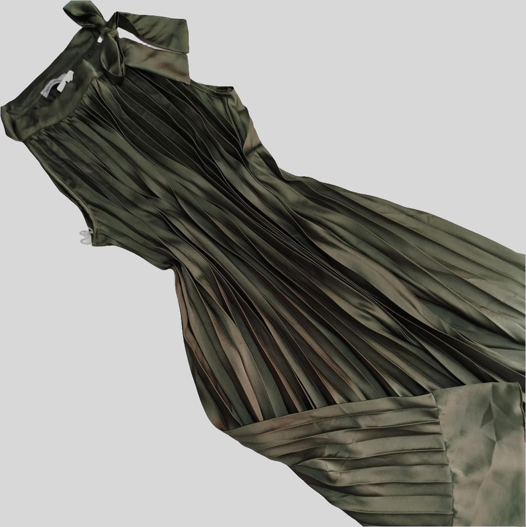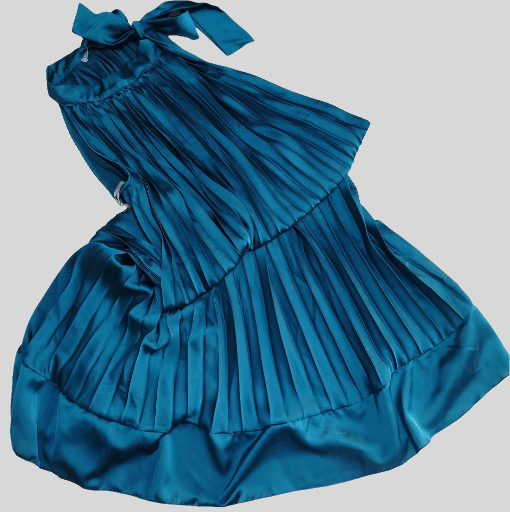 Duga svilena široka haljina sa faltnama i vezanjem oko vrata