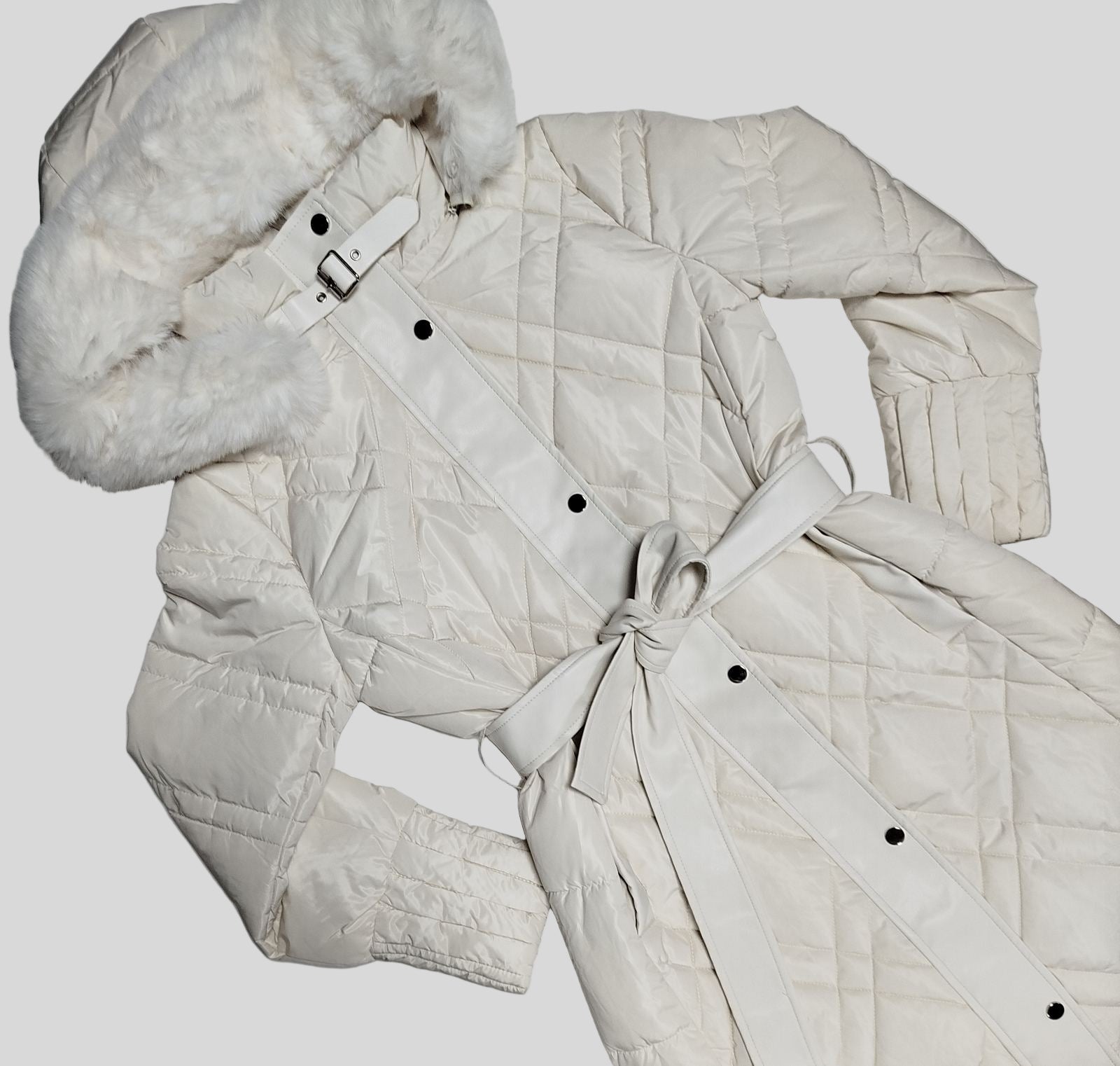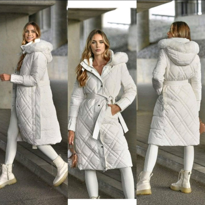Jakna sa krznom na kapi. Dužina ispod koljena.