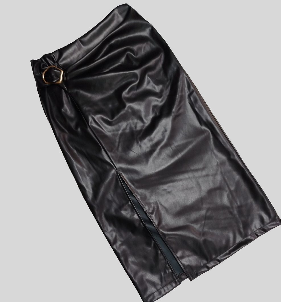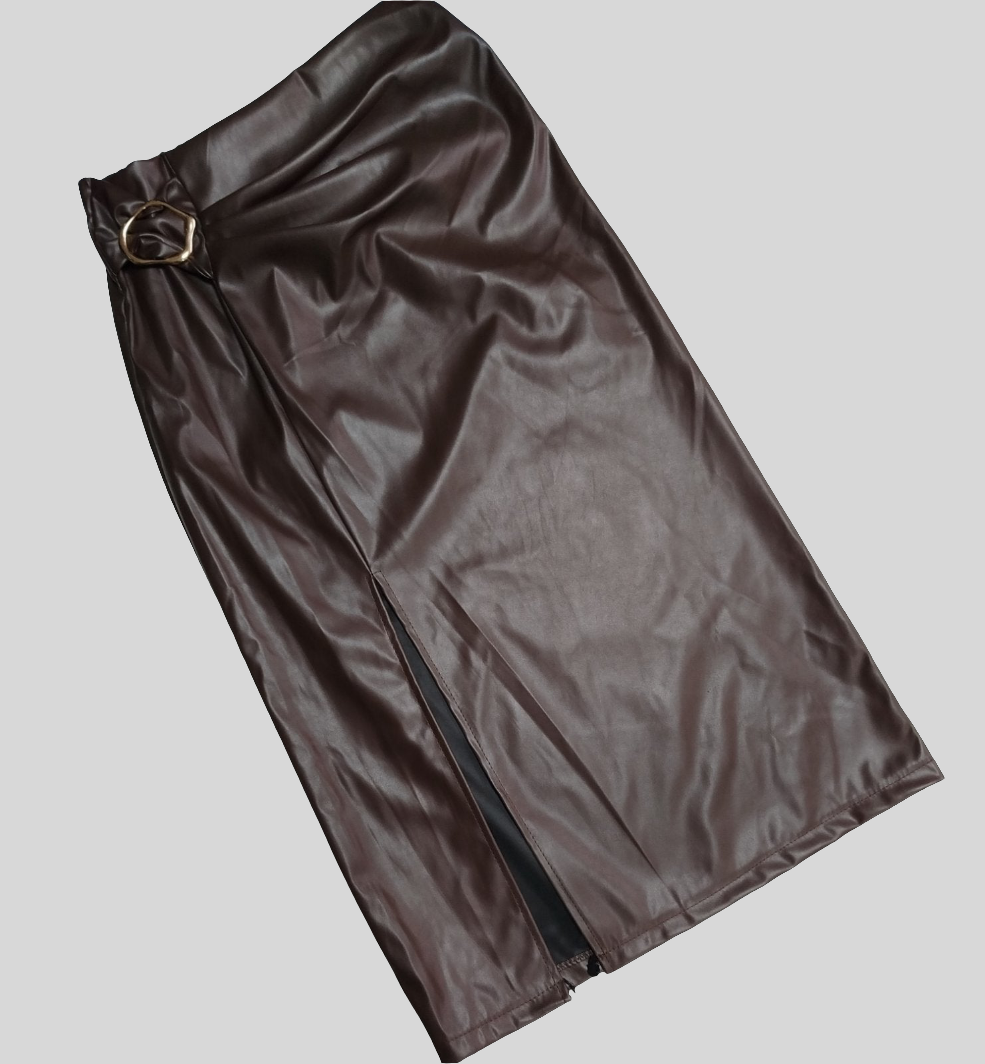 Kožna suknja sa elastinom i izrezom na nozi. Midi dužina